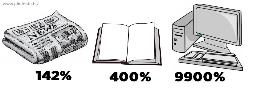 Sin ir más lejos, entre 1985 y 1994 la prensa escrita (periódicos) incrementaron el contenido de imágenes en un 142%. Hasta ahora, en el formato escrito (incluyendo libros, prensa y cualquier otro soporte similar), ha realizado un aumento del 400%. Cifra nada desdeñable, pero pequeña si tenemos en cuenta lo que ha sucedido en Internet: en apenas 7 años, se ha incrementado en un… 9.900%!