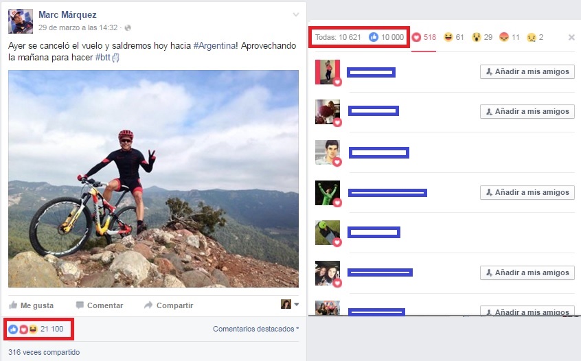 Aquí un ejemplo: una publicación muy reciente de Marc Márquez, del 29 de marzo, donde vemos claramente que obtuvo un total de 21.100 reacciones. Si nos vamos al detalle, mientras las cinco reacciones «nuevas» suman 621, los «me gusta» representan 10.000. Lo primero que sorprende es que el número de los likes es sospechosamente redondo (10.000), y lo segundo, es que no es lo mismo que se muestra de inicio, como cifra global. El total es de 10.621. No cuadra.